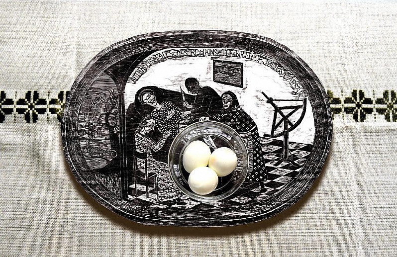 A foreign land with exotic creatures is demarcated on the left of Birthing Tray – Eggs, while navigation and journeys of exploration are also invoked through the representation of a sextant on the right-hand side of the tray. The phallic projection of the sextant is in tension with the bowl of eggs, suggestive of ova, and it in fact reiterates the shape of the raised knife of the surgeon. Alluding to a discourse in which the journey of expedition was conceptualised as a male penetration into a female interior, the motifs included in the work also reveal how acts of imperialist discovery – like caesarean births – were implicated in gendered violence.’ (Extract from Figuring Maternity: Christine Dixie’s Parturient Prospects by Prof. Brenda Schmahmann, Dearte n75_a4)