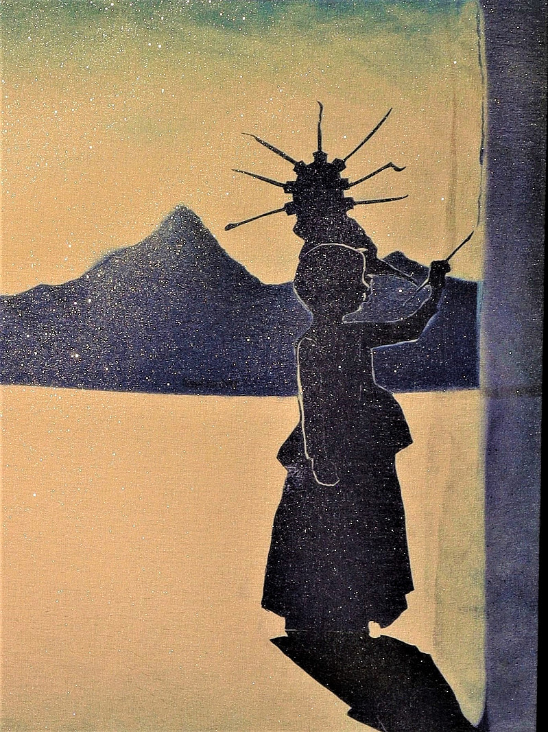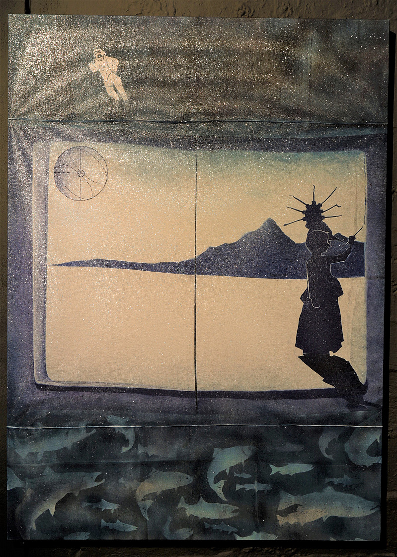 The princess and the Plague Doctor are no longer separate entities, but overlap in a single figure. Art and science, life and death merge in this figure who paints herself into existence. In the background a blue mountain range doubles as a chart of the Covid-19 pandemics rise and fall in Asia. Above, this barren landscape, floats an astronaut and below swim a school of fish.