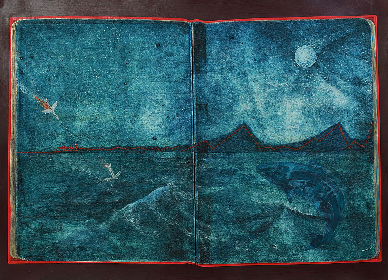 the sea as a burning aeroplane crashes into the waves alongside it. This flight