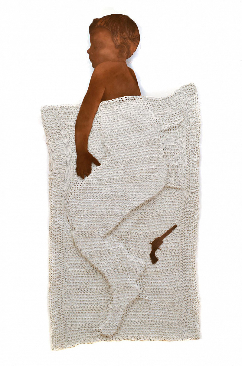 To Sleep and To Dream are the two works in this series that reference Hamlet's ' To sleep, perchance to dream". The toy gun that lies nearby tells the the story of a militarized society into which this boy child's has been enculturated.
