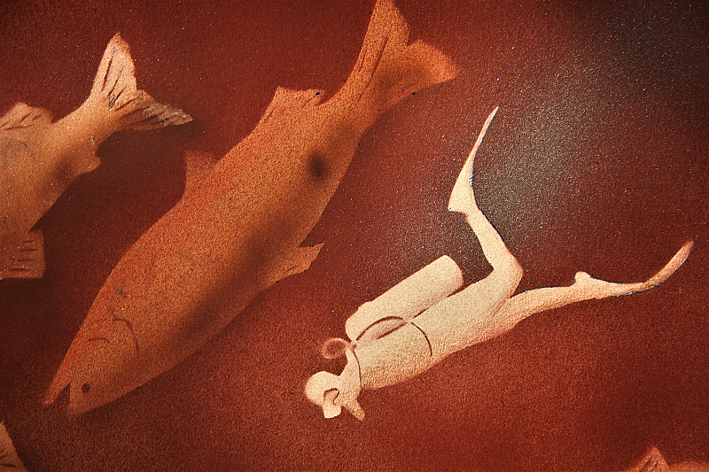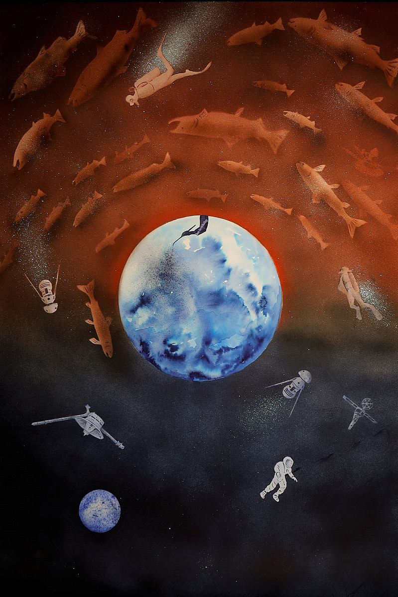 Fish float upside down in an orange haze, their future precarious, untethered to this world. A deep-sea diver follows in their wake, tracing the same arc as the spacecraft rotating around a blue sphere.