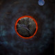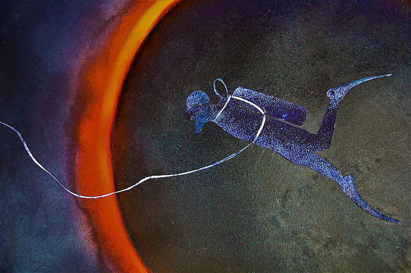 Dense, impenetrable, dark matter hovers over a glow of orange light. Drifting untethered in this dark sphere a lone diver floats, his breathing tube swirls into space like a umbilical cord cut free from its source.