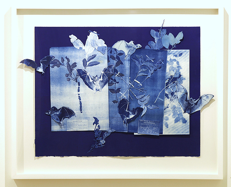 From the herbarium sheets gathered from the Albany History Museum in Makhanda, specimens from the Meliaceae family (chosen because their fruit is eaten by bats) threaten to escape the rigid boundaries of their prescribed pages. The bats that circle around Goya’s reader flit amongst the botanical pages, disturbing his sleep and ours.