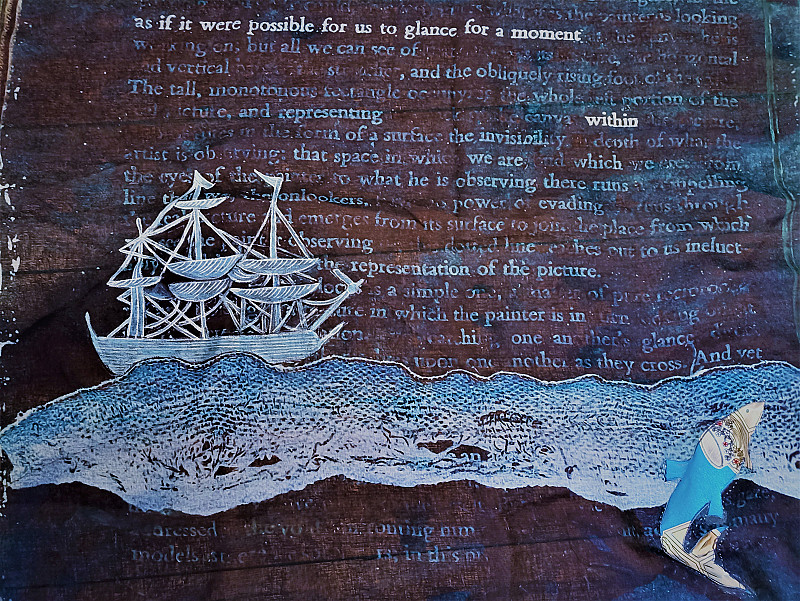 Collage, sewing, transfer and stencil on voile