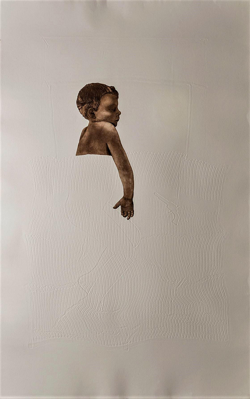 The prints To Sleep and To Dream frame the narrative reference Shakespeare’s Hamlet. In both of these prints the child is covered by a blanket. The crochet blanket evokes a maternal, comforting space. However, if you look closely, inserted within the blanket is an embossed gun. The gun, based on a toy gun belonging to my son deliberately disrupts the image of the innocent sleeping child, and in doing so it anticipates the next phase in his life.