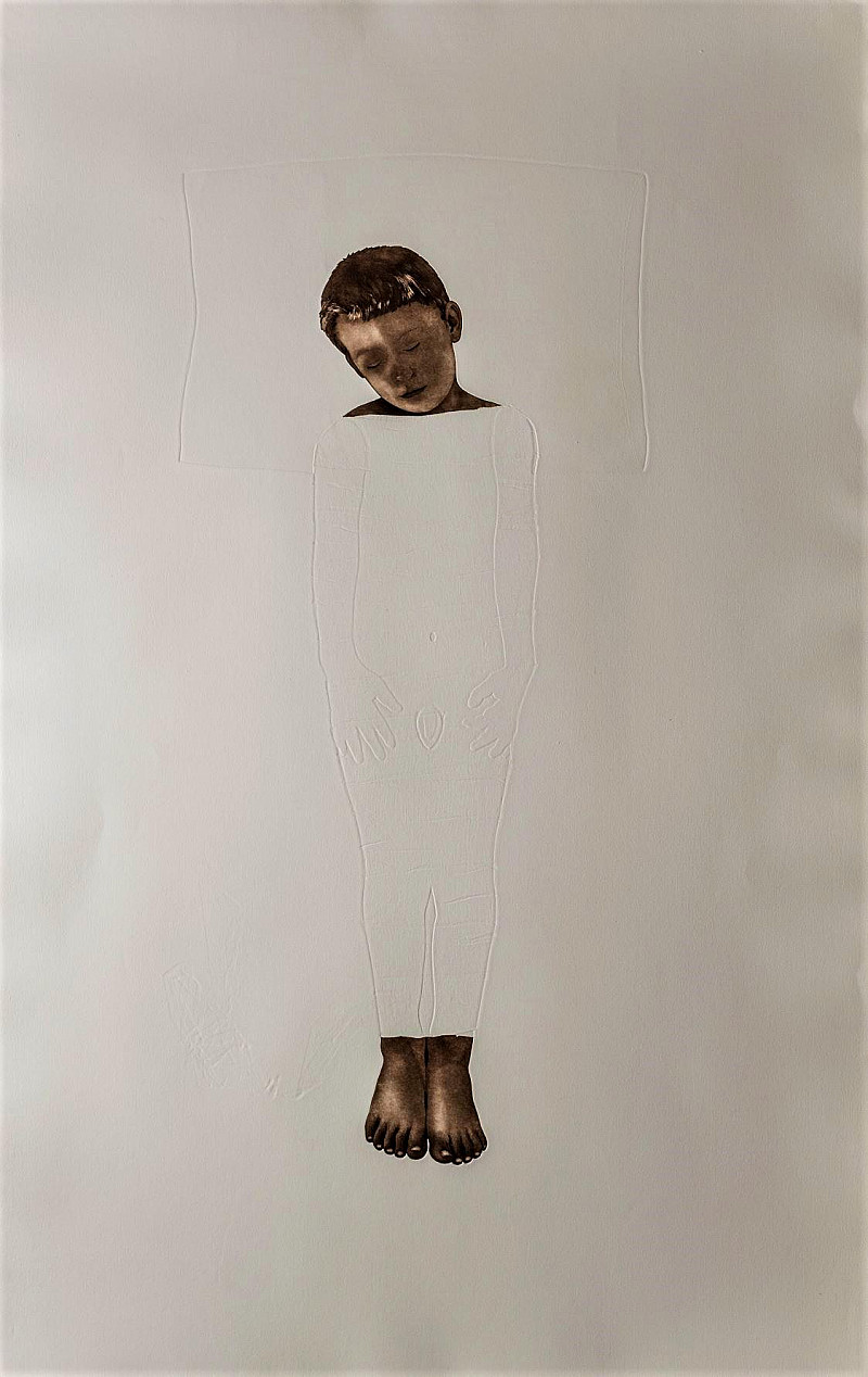 Bind refers to the binding which takes place in the story of the sacrifice in the Abraham and Isaac story. In his book The Death and Resurrection of the Beloved Son: The Transformation of Child Sacrifice, Jon D. Levenson suggests that binding a person was a standard procedure in human sacrificial rites. The bandages that I used in this print also reference the swaddling cloth that Christ was wrapped in as a baby, as well as Christ’s shroud. So this image incorporates the baby, the sacrificial child and the death of Christ. The act of binding it is suggested is enacted from birth to death.