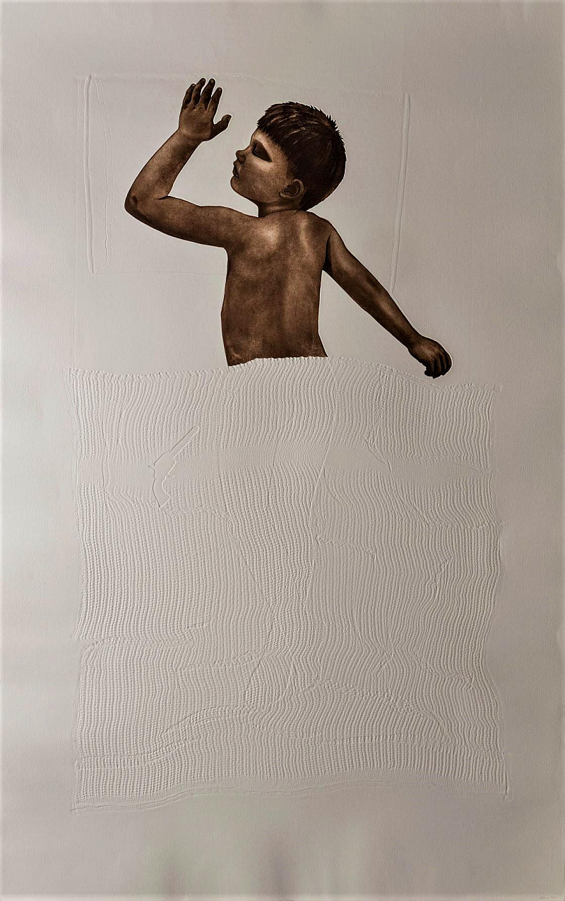 The prints To Sleep and To Dream frame the narrative reference Shakespeare’s Hamlet. In both of these prints the child is covered by a blanket. The crochet blanket evokes a maternal, comforting space. However, if you look closely, inserted within the blanket is an embossed gun. The gun, based on a toy gun belonging to my son deliberately disrupts the image of the innocent sleeping child, and in doing so it anticipates the next phase in his life.