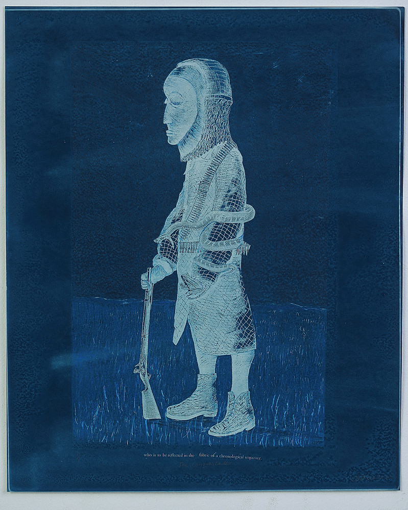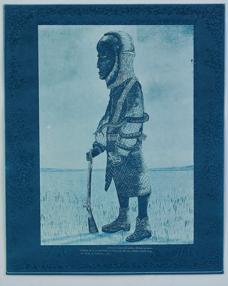 land he has helped colonise and upon which he sets the butt of his rifle. A snake