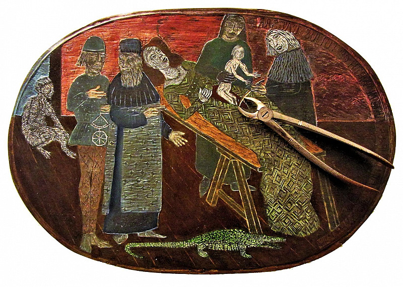 Painted woodcut with inlaid medical instrument