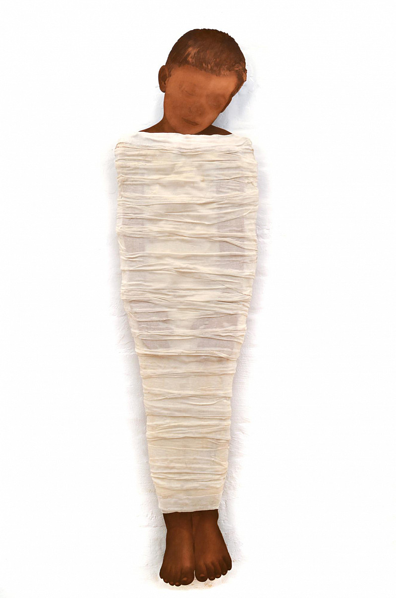 This work depicts the moment in the narrative of the aqedah when the child is bound. Historically human sacrificial victims were bound so as not to struggle at the moment of death.